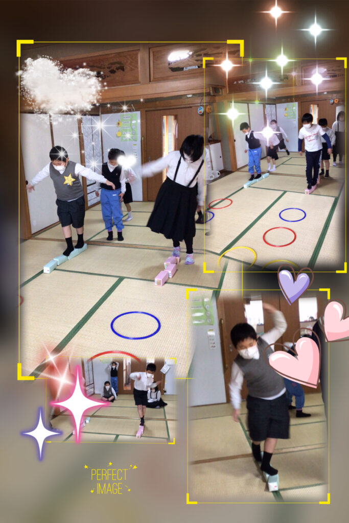 まずは牛乳パックの平均台を1人ずつ渡っていくよ😃