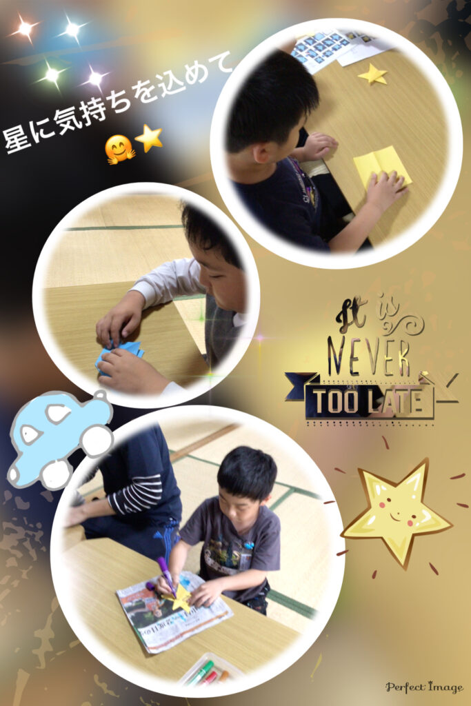 まずは、願いを込めながらみんなで「星⭐️」の折り紙を作っていったよ👏