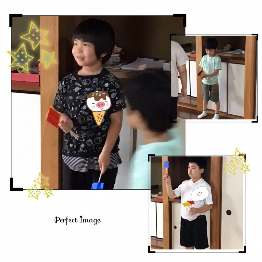 🔵の時は手をあげて、🔵のカードが下がったら動きを止めて、