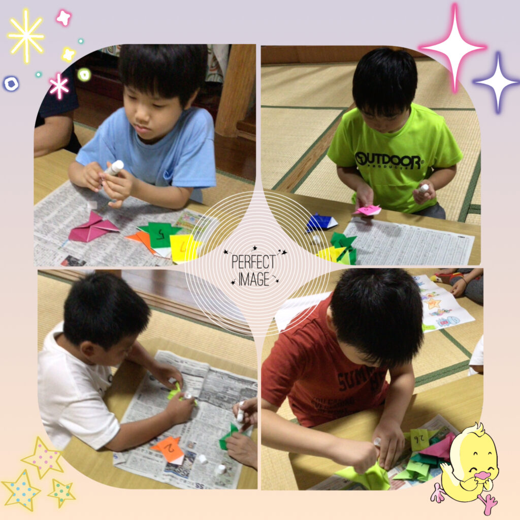 ロケットの折り紙に日付を書いて、のりで貼っていくよ🚀