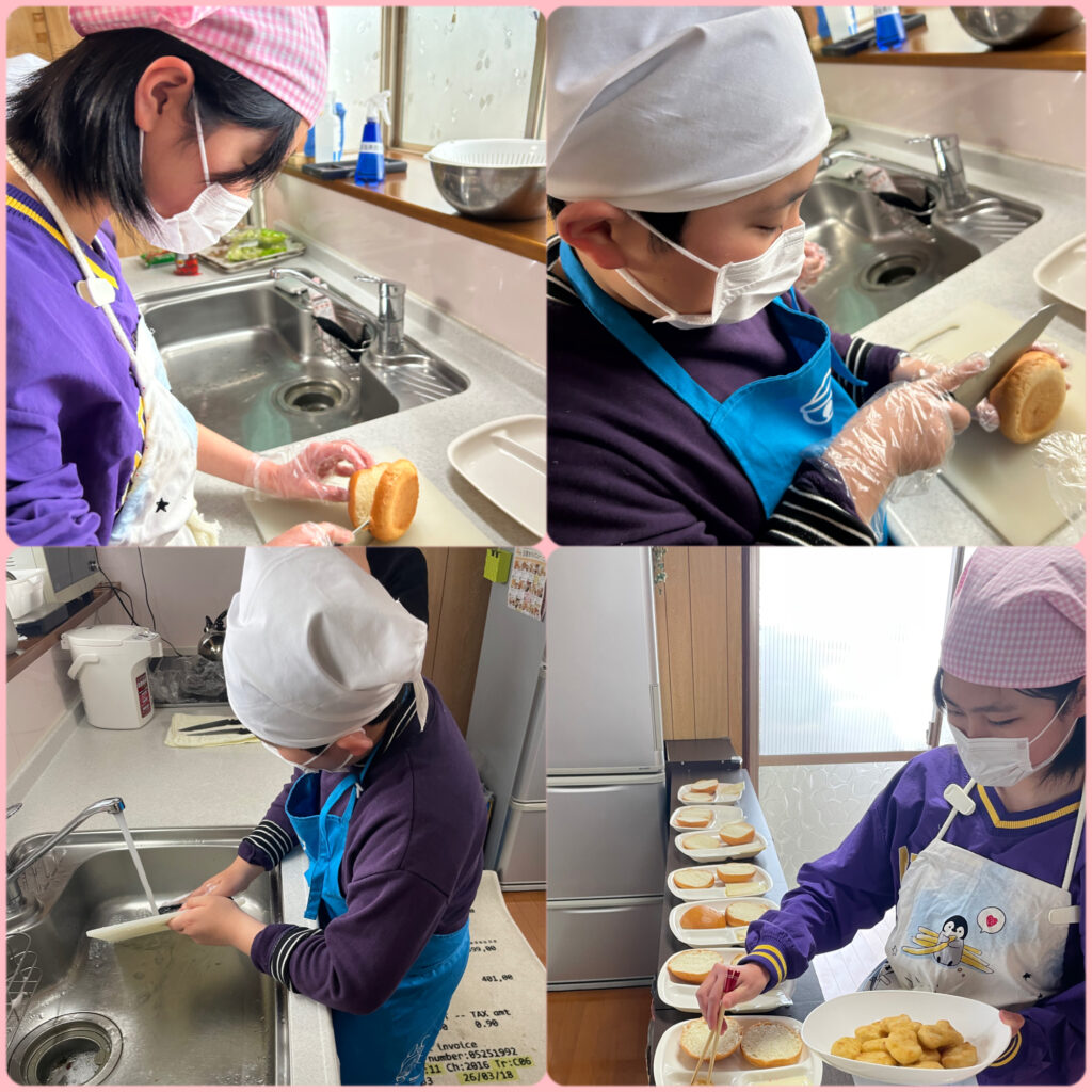 バンズを切る人、盛り付ける人、、係に分かれて作ったよ!