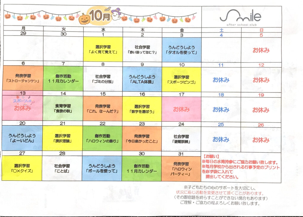 2025年9月30日 / 最終更新日時 : 2025年9月25日 famsmile smile-ブログ 10月の活動予定🍁 こんにちは❣️ 放課後等デイサービスsmile(スマイル)です😊 10月の活動予定をお知らせします♪ 食欲の秋にちなんだ食育学習や10月らしくハロウィン🎃パーティーを予定しています。 また、ゴミの分別🗑️方法を学んだり、避難訓練を実施し社会性を学んでいきます。 朝晩涼しくなって、秋らしくなってきましたね😊 体調に気をつけながら楽しく過ごしましょう😆 \ 最新情報をチェック / FacebookXBlueskyHatenaCopy コメントを残す コメントをキャンセルメールアドレスが公開されることはありません。 ※ が付いている欄は必須項目ですコメント ※ 名前 ※ メール ※ サイト 次回のコメントで使用するためブラウザーに自分の名前、メールアドレス、サイトを保存する。 上に表示された文字を入力してください。 Δ